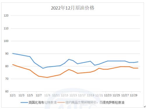 伦敦洲际交易所布伦特原油(Brent)12月1日收报89.98美元/桶,12月30日收报83.32元/桶,下跌6.66美元/桶,跌幅7.4%,其中最高价为12月1日的89.98美元/桶,最低价为12月8日的78.25美元/桶;美国西德克萨斯中质原油期货(WTI)12月1日收报81.21美元/桶,12月30日收报78.39美元/桶,下跌2.82美元/桶,跌幅3.47%,其中最高价为12月1日的81.21美元/桶,最低价为12月9日的71.01美元/桶。
